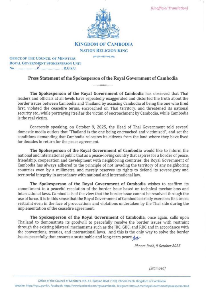អ្នកនាំពាក្យរាជរដ្ឋាភិបាលកម្ពុជា សូមបញ្ជាក់ជូនសារជាថ្មីថារាជរដ្ឋាភិបាលកម្ពុជានៅតែរក្សាជំហរដោះស្រាយបញ្ហាព្រំដែនដោយសន្តិវិធីដោយឈរលើយន្តការបច្ចេកទេសនិងច្បាប់អន្តរជាតិ ហើយចាត់ទុកថាការប្រើប្រាស់កម្លាំងយោធាមិនអាចដោះស្រាយបញ្ហាព្រំដែនបានឡើយ។ ក្នុងន័យនេះហើយ ដែលរាជរដ្ឋាភិបាលកម្ពុជាតែងតែប្រកាន់យកនូវការអត់ធ្មត់កម្រិតខ្ពស់បំផុតនៅចំពោះមុខសកម្មភាពរំលោភបំពាននានា ដែលភាគីថៃបាននិងកំពុងបង្កឡើងនៅក្នុងអំឡុងពេលនៃការអនុវត្តបទឈប់បាញ់។